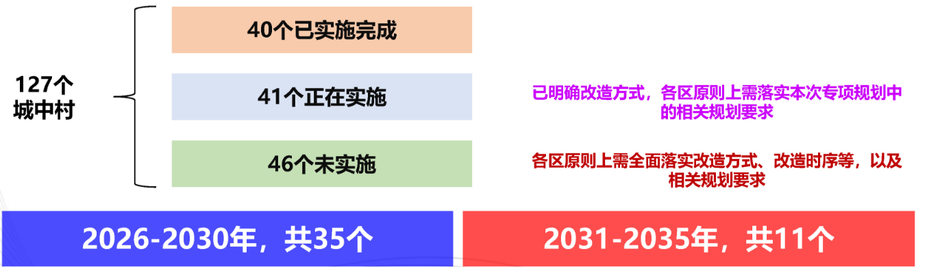具体来看,127个城中村中,40个已改造完成,41个正在改造,还有46个未进行改造。未来,2026-2030年将完成35个城中村改造,2031年-2035年完成剩余11个城中村改造。