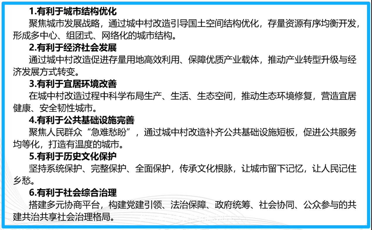 1、协同更新:统筹民生改善与经济发展,通过城中村改造提升人居环境品质,激发城市活力,着力破解发展不平衡不充分问题。