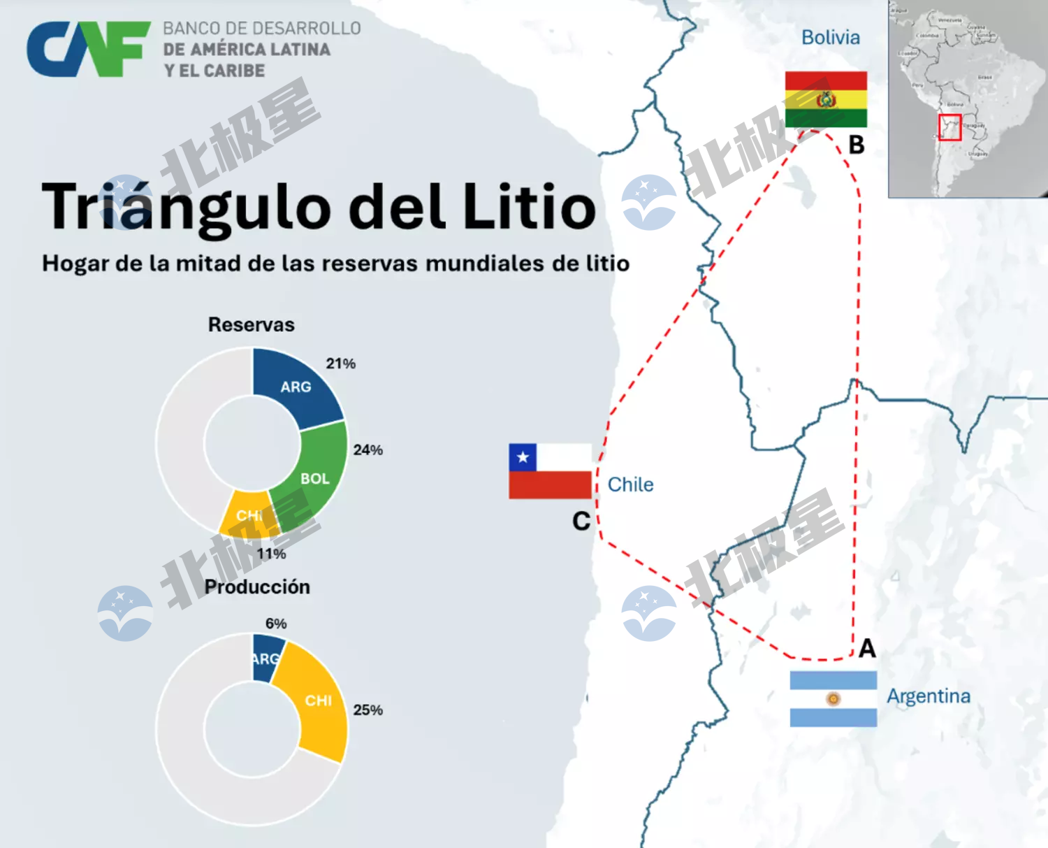 2025年12月3日,拉丁美洲和加勒比开发银行(CAF)的行业分析师Luisa Rivas,发表了一篇关于“南美锂三角”竞争现况的评论,文章将阿根廷Argentina、玻利维亚Bolivia和智利Chile三个国家名称简写,比喻为“锂的ABC三叉戟”。文章称,阿根廷、玻利维亚和智利组成了一个联合体,其联合行动可能决定能源转型的未来。作为“锂三角”的三大主角,三个国家在南美地区拥有近全球一半的锂资源,但每个玩家又有不同的角色定位。