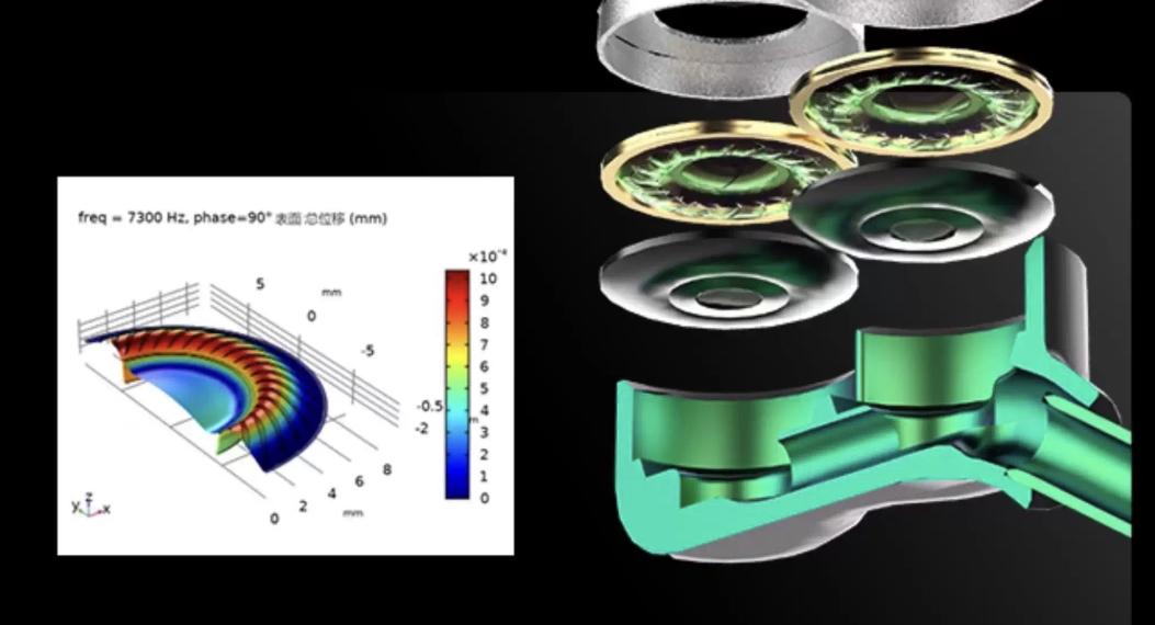 动圈相关,镀晶生物振膜我很有兴趣,但并没看到详细陈述,不明所以。倒是看到了一张重要的图示:少见的把振膜受力的能量分布图给了出来,懂行的想必知道,动圈膜片失真性能的好坏,这图可以体现出蛮多,对边缘张力形变的失真控制,一直是比较隐晦但又重中之重的事情,能给出这张图的,说明很清楚研发重点在哪,且与此研发相关的精密测量和计算等技术实力,是不容小觑的。