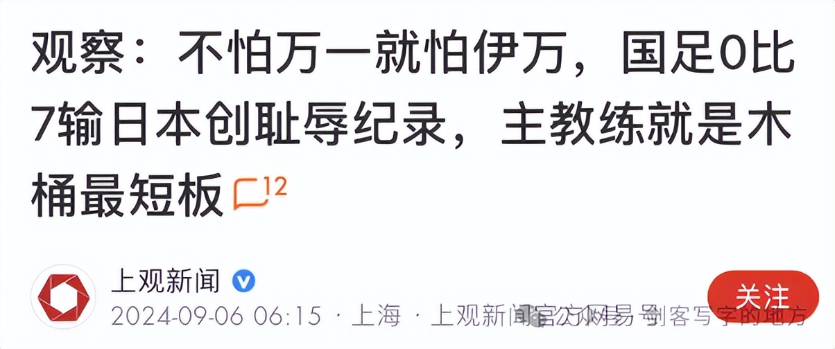 触目惊心,0:7的确非常耻辱,但是在那之后大喊“责任全在主教练”的行径,比那名在球场上痛斥“球踢不过可以踢人”的球迷的勾当,更让人惊诧。