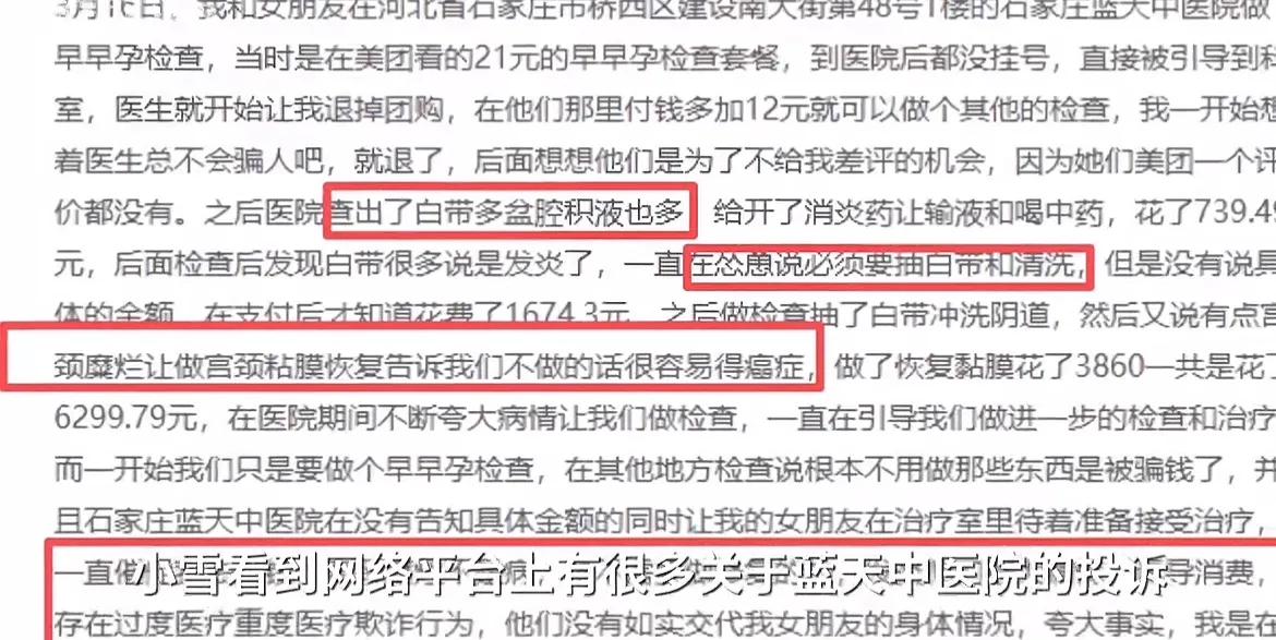 其实,事情的过程还是挺曲折的,1个多月前,一名叫做“大辉”的博主接到一名女孩(下称小雪)的求助,说是在石家庄蓝天医院遭遇过度检查,乱收费,博主大辉第一时间曝光了此事,事件得到一定的关注,但是大辉曝光此事后,收到大量的恶意举报、私信谩骂和人身威胁,最后曝光视频被下架,博主大辉出于安全考虑,也没再敢发布相关视频。