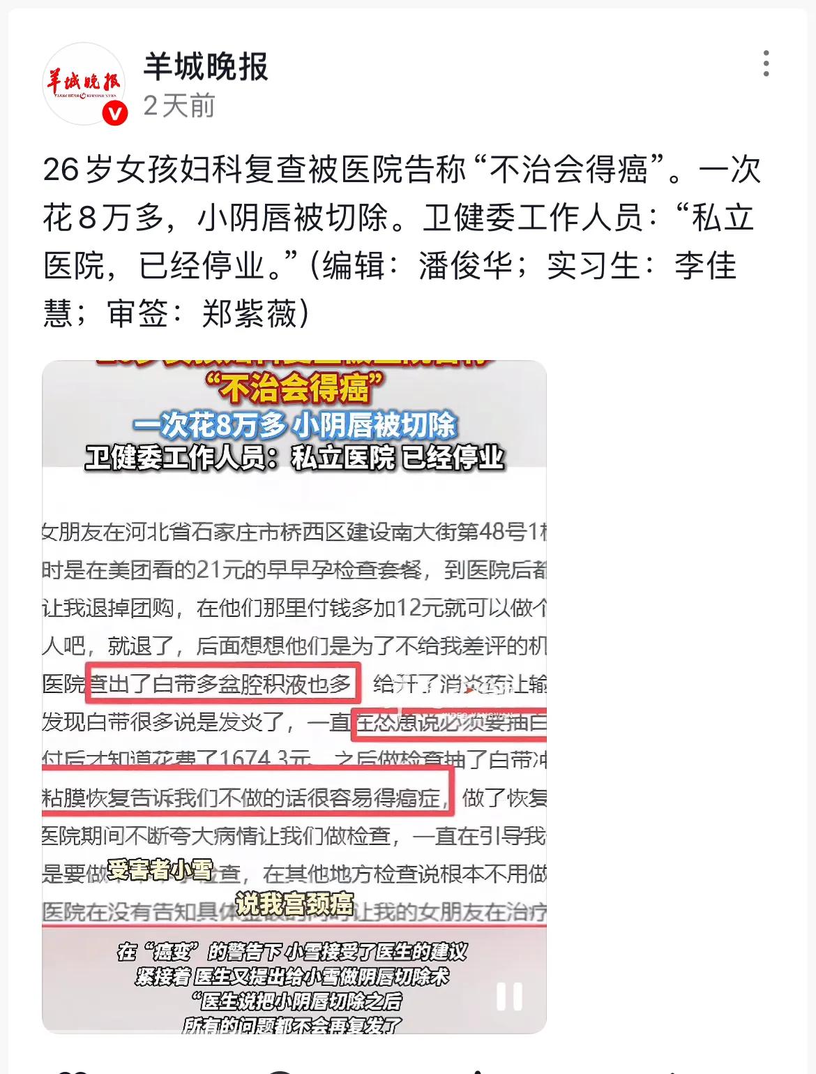 26岁的小雪在石家庄工作,今年9月21日她在北京游玩期间因腹痛前往北京京煤集团总医院做了彩超和血常规检查,当时北京的医院没有说太严重的问题,建议定期复查即可。回到石家庄后,小雪只是去离家较近的蓝天医院做个复查,医生称发现新问题,“如果不做手术,可能会导致癌变”,还说她是宫颈癌,旁边还放着宫颈癌的图片,把她吓哭了。当小雪表示无力支付手术费用时,医生建议她借款治疗,甚至让她套花呗。小雪向朋友借了2万5,又在花呗上贷了5万,一下午的时间各种费用花了8万元。