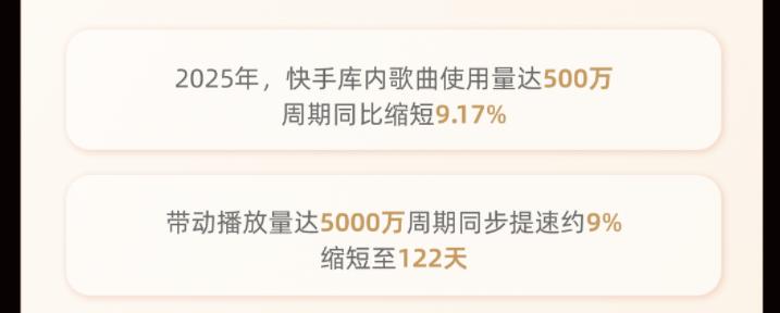 报告显示,在快手搜索音乐曲目的行为日均突破500万次,日均播放总时长同比增长5%,高粘性的消费习惯与主动化的消费行为,标志着快手用户音乐消费进入深度阶段,大幅缩短了歌曲从“被创作者使用”到“被用户观看”的传播周期。2025年,快手曲库内歌曲使用量达500万次,其传播周期同比缩短9.17%;带动播放量突破5000万的爆款歌曲,传播周期同步提速约9%,缩短至122天,实现了歌曲热度的快速发酵。