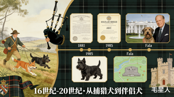 苏格兰梗(Scottish Terrier),昵称“苏格兰小子”(Scottie),是源自苏格兰高地的古老梗犬品种,其历史可追溯至16世纪。与西部高地白梗、凯恩梗同属苏格兰高地梗犬家族,拥有共同的祖先——活跃于苏格兰岛屿与高地的原生工作梗犬。最初被苏格兰农民与猎人用于在石堆、洞穴中追捕狐狸、水獭、老鼠等害兽,凭借矮小体型与坚韧性格成为高地地区不可或缺的捕猎助手。