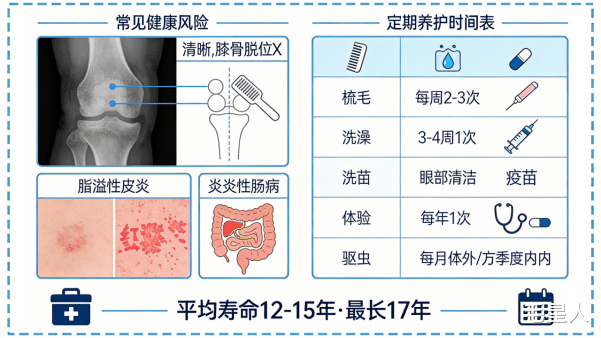 •关节问题:髌骨脱位与髋关节发育不良高发,表现为跛行、活动减少,需避免剧烈跳跃,定期进行关节检查;