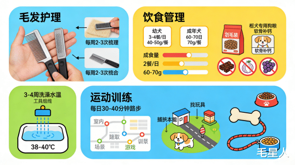 需严格规避的食物包括:巧克力、洋葱(引发溶血)、葡萄(导致肾衰竭);老年犬可添加关节保健品(如氨基葡萄糖),预防关节老化。夏季需保证充足饮水,因其被毛浓密,高温环境下易中暑,室内温度建议控制在26℃以下。