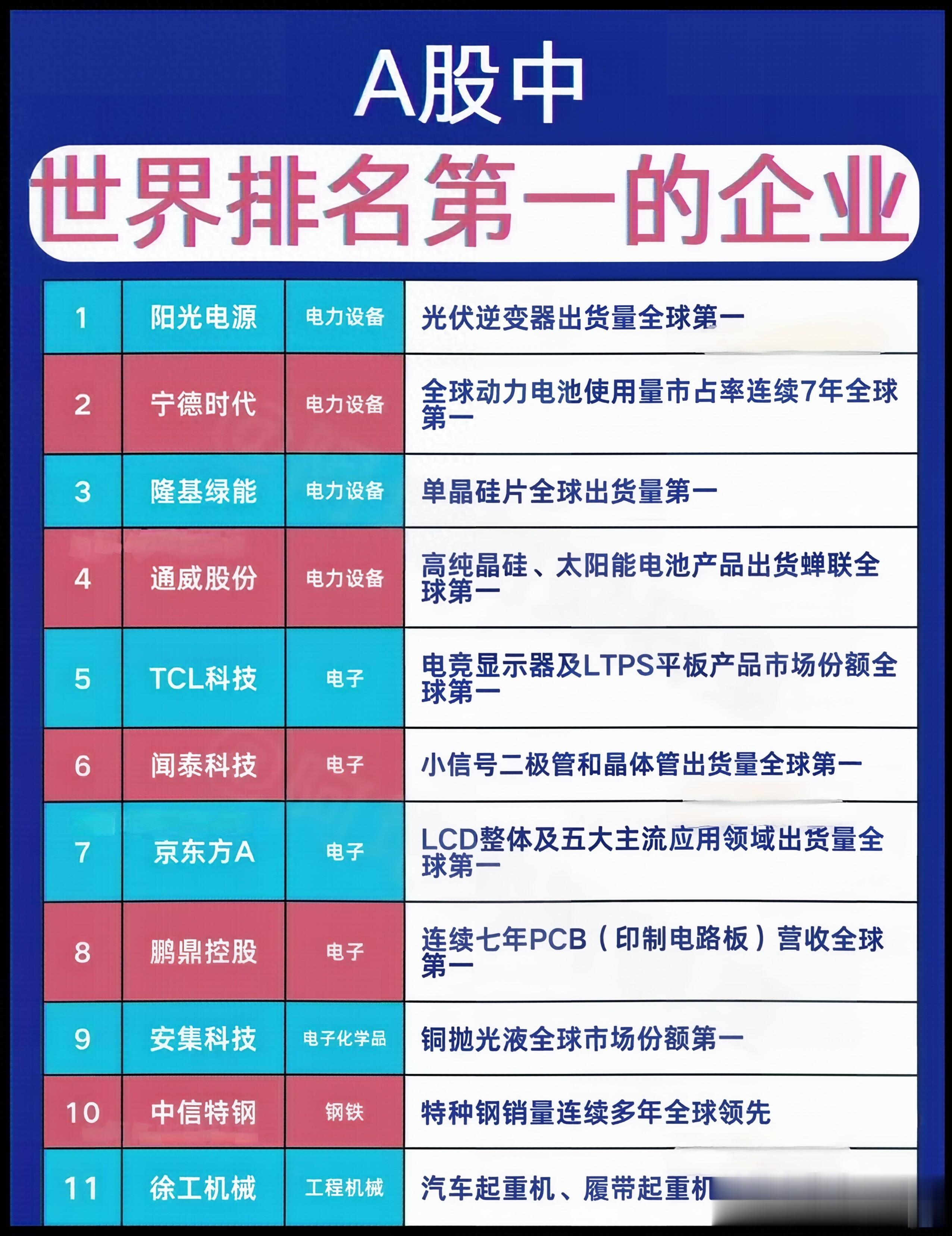 这十来年我国的发展,尤其是科技的发展非常明显,取得了很多成果。我国的很多企业这十来年也是茁壮成长,变大变强。有一部分企业由国内第一变成了世界第一。A股中这样世界排名第一的公司有55家。