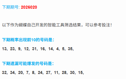 本期分析:本期的冷热分布,本期的遗漏大于9的号码有6个,上期的冷码开出了0个号码,温码开出了4个号码,上期热码开出了1个号码,上期果然温码开出了4个号码,本期的冷码依旧不多,考虑1个左右即可,热码近期不活跃,考虑1个号码,温码考虑2到3个号码。(热码:蝴蝶算法中概率前10的号码,只有10个;冷码:遗漏大于等于9的号码;温码:排除前2类之外的剩下的号码,都是温码;)