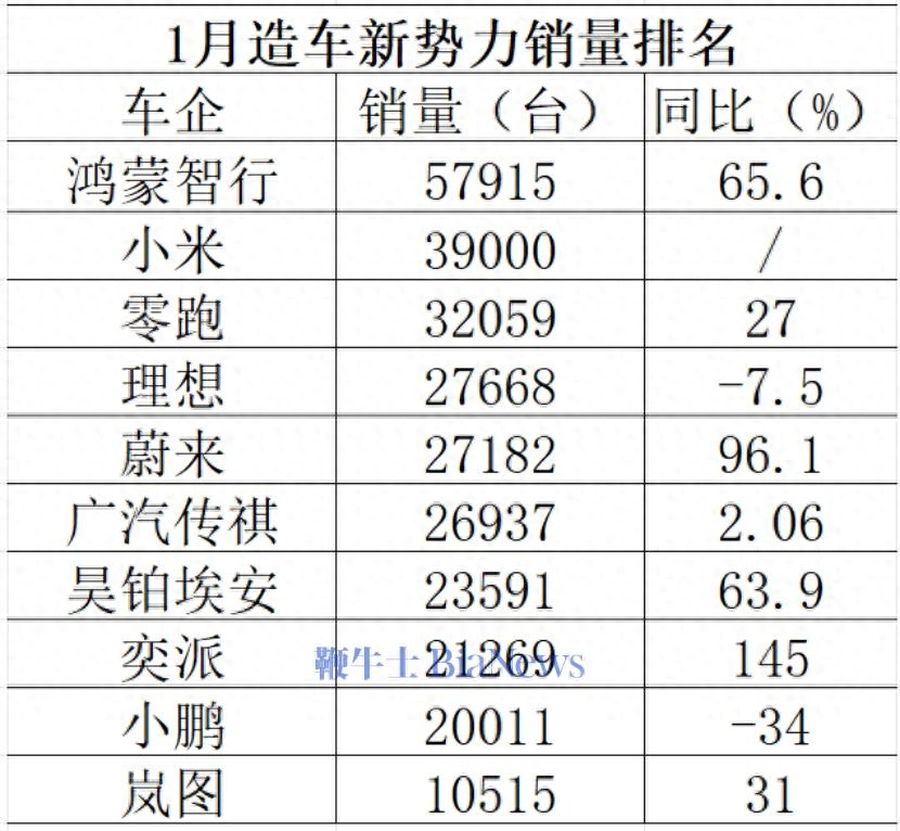 相较同环比表现而言,更值得关注的是头部排名迎来洗牌。根据截至发稿前数据统计,去年稳坐新势力月销冠军并获得新势力全年销量冠军的零跑汽车,1月被鸿蒙智行和小米汽车反超,新势力冠军宝座或许要易主。