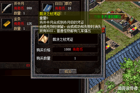 先看图,如上图所示,以这个裁决之杖凭证为例子,它可不是类似当初魔龙版本里那种藏宝图凑一块加点金刚石合成对应装备的操作,而是用这类凭证可以有概率把低端的武器合成高端的武器。玩家可以拿着井中月利用这个裁决之杖凭证去合成裁决之杖,上面说明了,无效时保留,成功或者失败的时候消失。