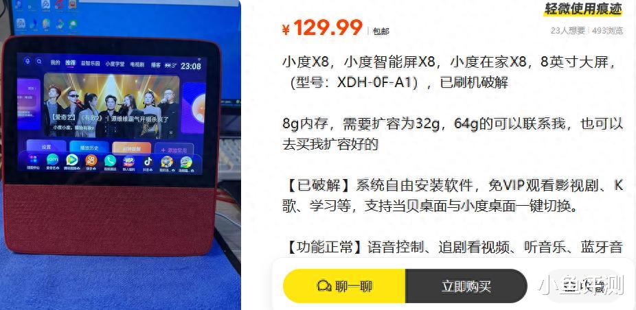 最近我在二手鱼闲逛,发现有个老哥在出小度X8,标注是已刷机破解,只要129元。我记得那时候的小度X8,也算是智能家居里的网红产品了,新机价格好像是300多,现在价格不仅被打下了了,甚至还是刷机版。