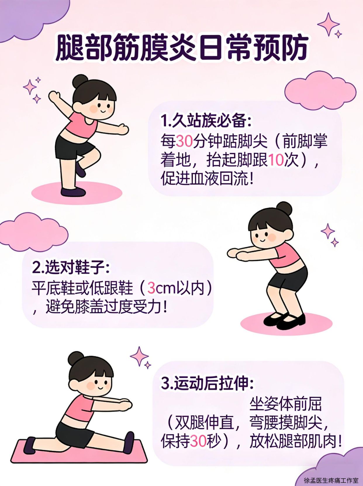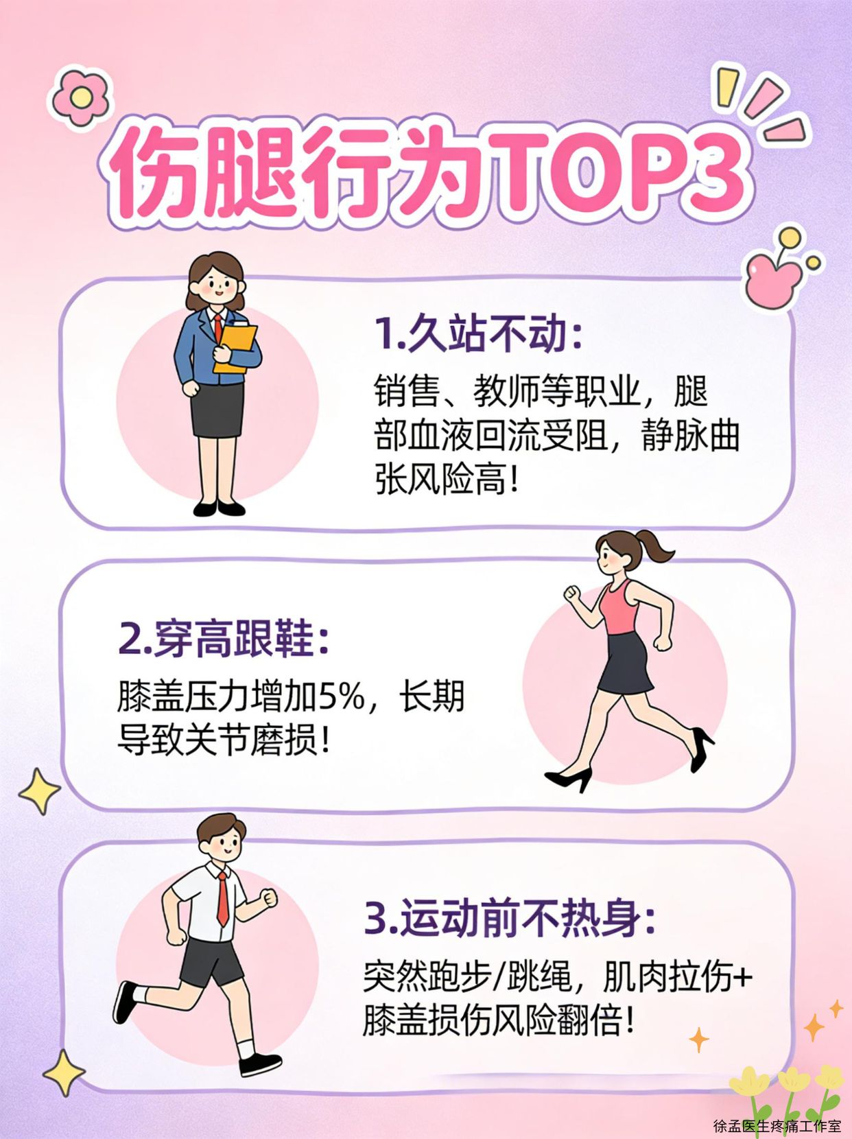 大家是不是总觉得腿又酸又胀?膝盖走路时“咔咔”响?别以为只是疲劳!腿疼可能是身体在“报警”!今天教你自查+预防,看完直接拥有‘健康腿’!” 腿疼的“隐藏信号”1⃣久站后小腿肿胀,按下去有坑2⃣膝盖上下楼梯时刺痛,不敢用力3⃣腿抽筋频繁,尤其是半夜⚠伤腿行为TOP31⃣久站不动:销售、教师等职业,腿部血液回流受阻,静脉曲张风险高!2⃣穿高跟鞋:膝盖压力增加25%,长期导致关节磨损!3⃣运动前不热身:突然跑步/跳绳,肌肉拉伤+膝盖损伤风险翻倍!💡3招预防,腿疼不再来!✅久站族必备:每30分钟踮脚尖(前脚掌着地,抬起脚跟10次),促进血液回流!✅选对鞋子:平底鞋或低跟鞋(3cm以内),避免膝盖过度受力!✅运动后拉伸:坐姿体前屈(双腿伸直,弯腰摸脚尖,保持30秒),放松腿部肌肉! “腿部健康影响全身!从今天起,少久站、多拉伸,选对鞋子,和‘腿疼’说再见~ 评论区聊聊:你最爱哪个护腿动作?👇
