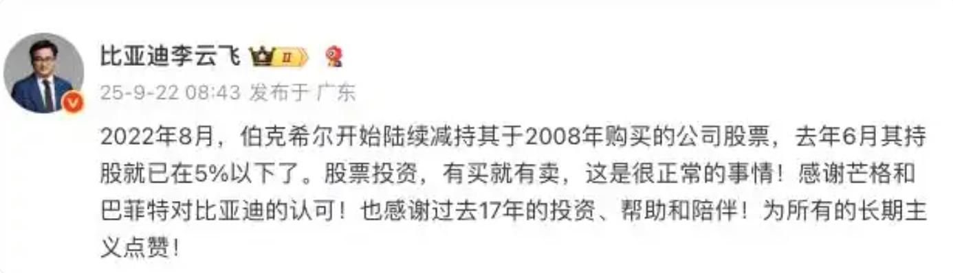针对巴菲特清仓比亚迪一事,9月22日,比亚迪集团公关处总经理李云飞在社交平台发文称,2022年8月,伯克希尔开始陆续减持其于2008年购买的公司股票,去年6月其持股就已在5%以下了。股票投资,有买就有卖,这是很正常的事情。感谢芒格和巴菲特对比亚迪的认可,也感谢过去17年的投资、帮助和陪伴,为所有的长期主义点赞。