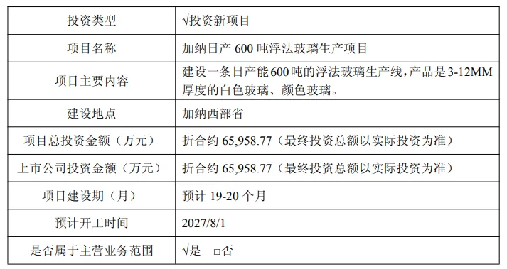 据公告披露的项目情况,加纳浮法玻璃项目将建设一条日产600吨的浮法玻璃生产线,项目建设期预计为19-20个月,预计开工时间为2027年8月1日。