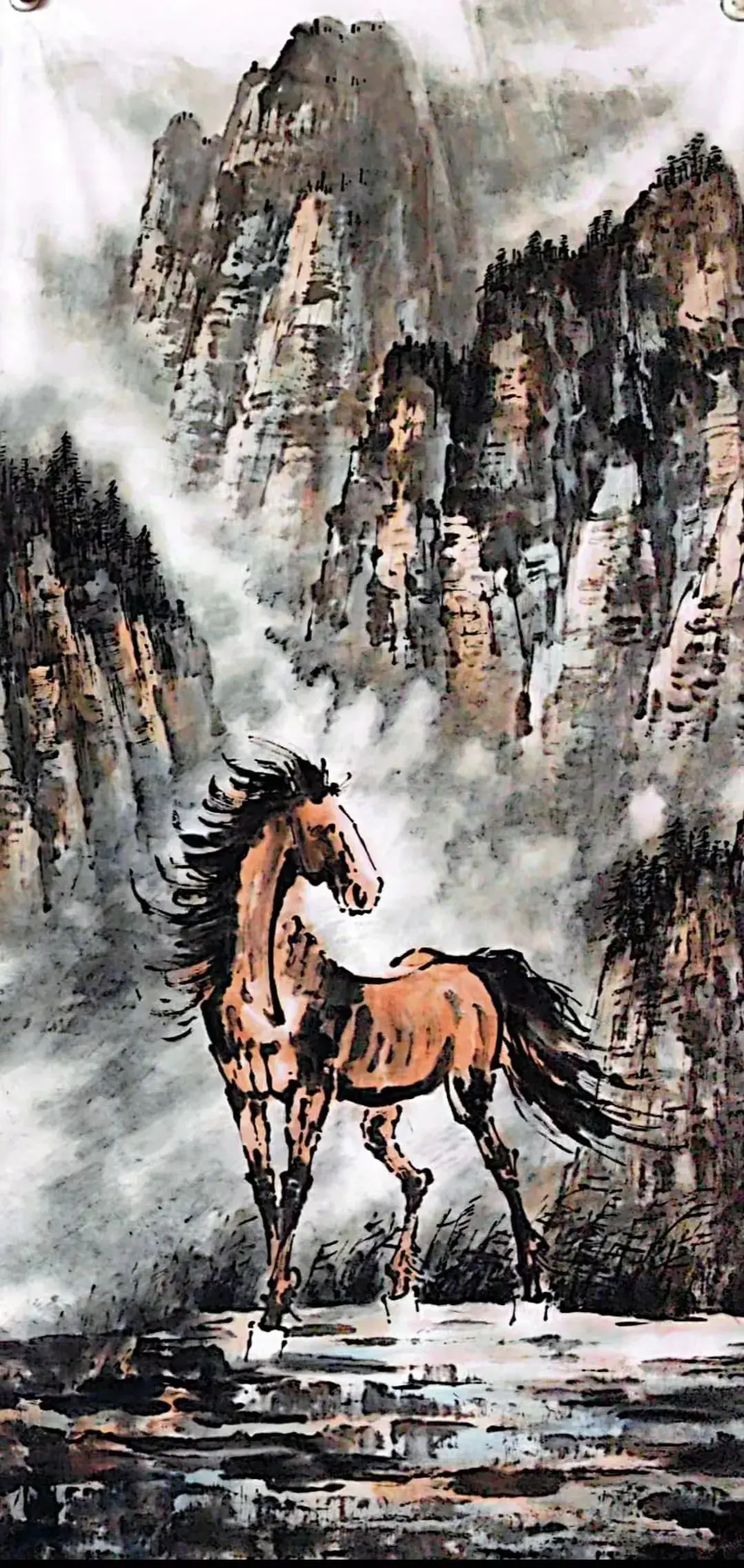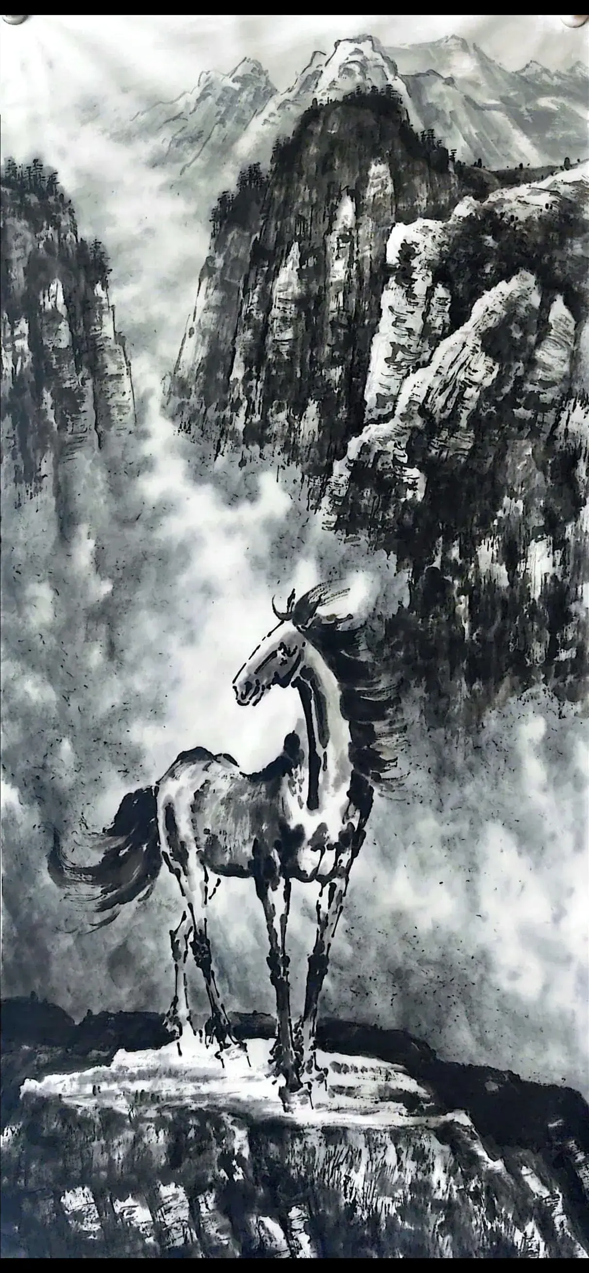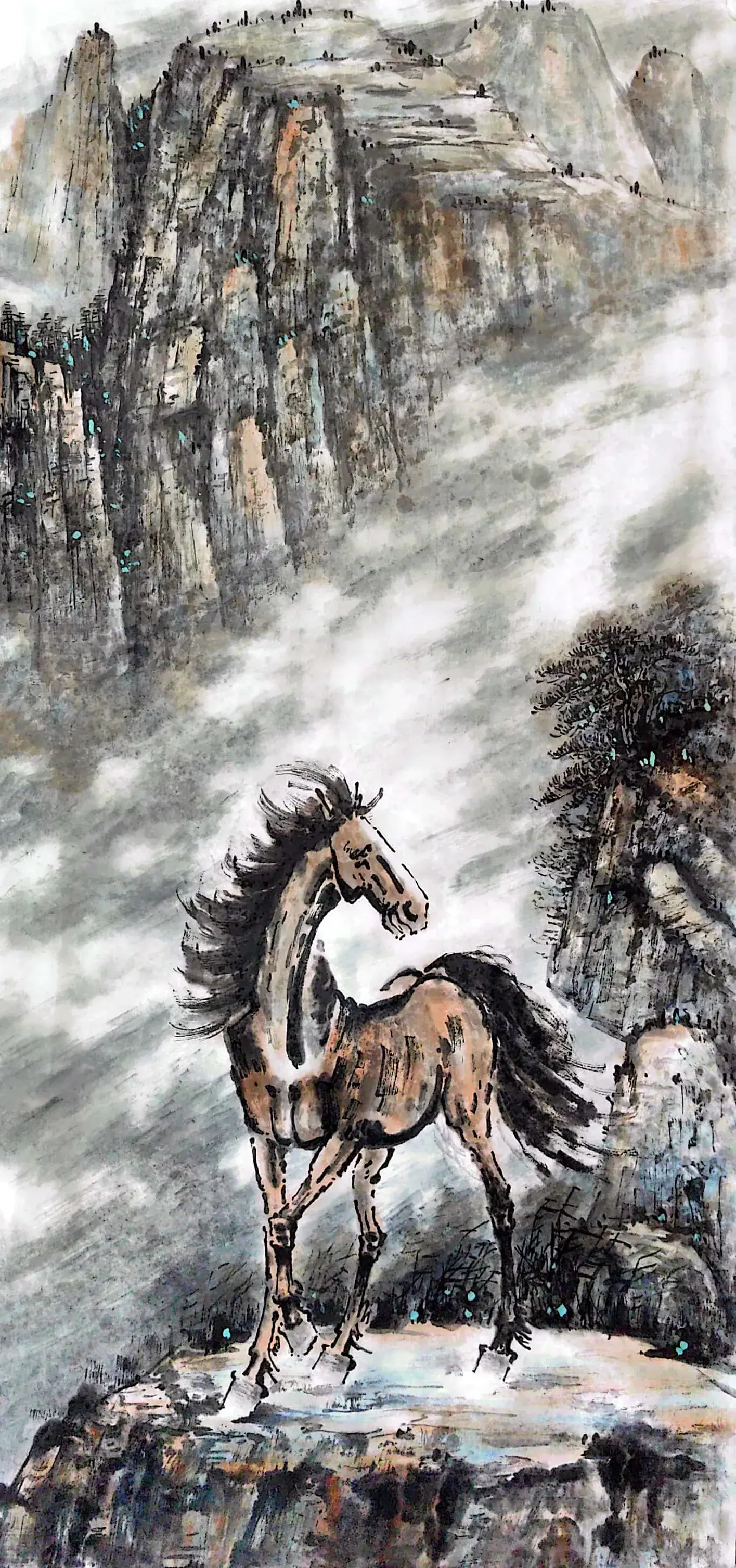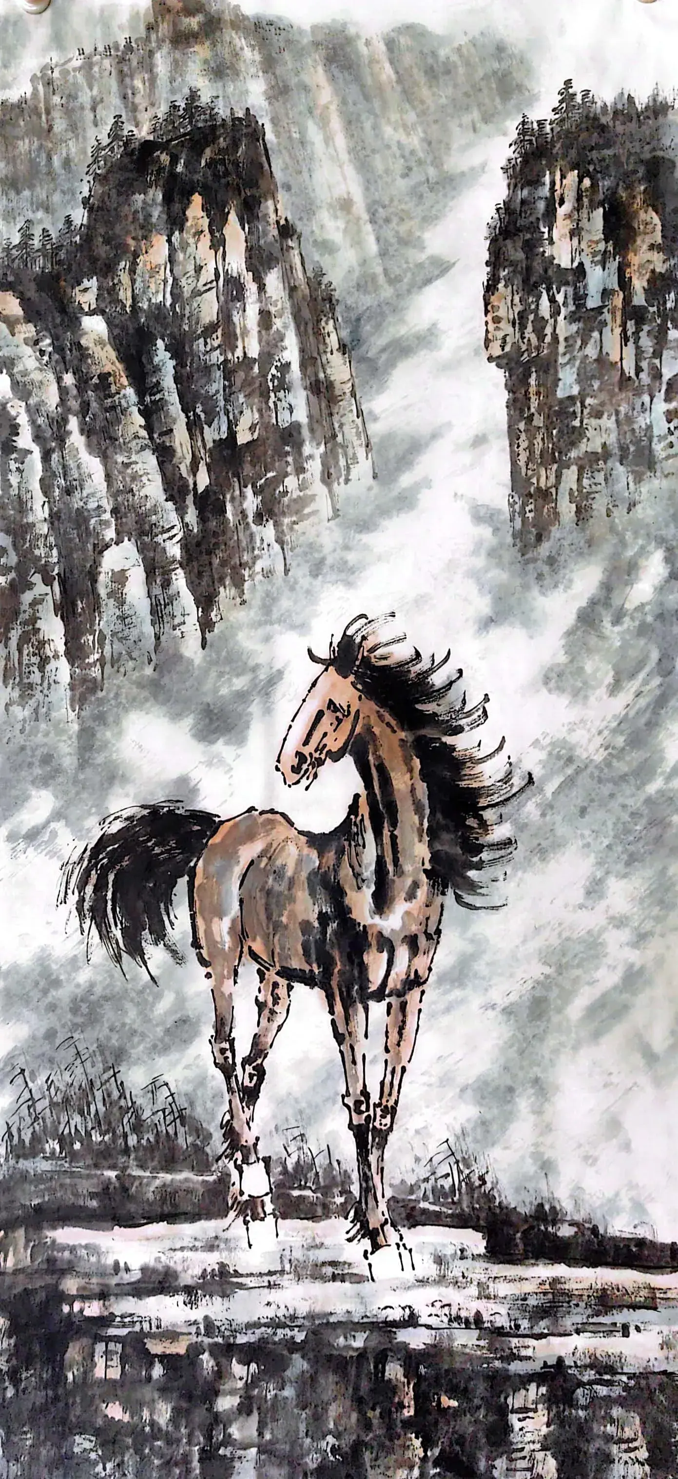 周鸿石以水墨大写意的形式来表现马的精神特质。他用笔精炼而有力,色彩温婉而自然,通过水墨的浓淡、干湿、深浅,表现出马的忠诚、勇敢、勤劳、昂扬向上、势不可挡、勇往直前的精神特质。