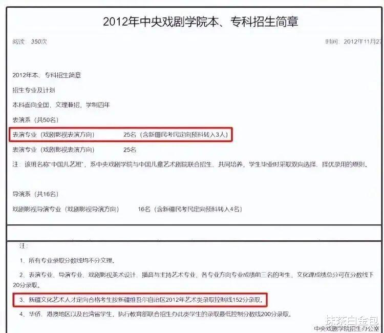 有网友找出中戏2012年的官方招生简章,上面清楚写着表演系专业包含“新疆民考民定向预科转来三人”,文化课录取分数线为152分。