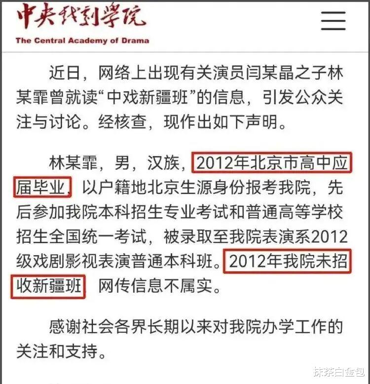 闫学晶因为犯了众怒,不止痛失大酱代言,人们还发现她的儿子明明是汉族,却考上了中戏的新疆班,涉嫌利用民族政策牟利。为此,中戏特意发布声明,宣称闫学晶之子林傲霏并非民族班学生,2012年中戏也没有招收新疆班,是网友们搞错了。