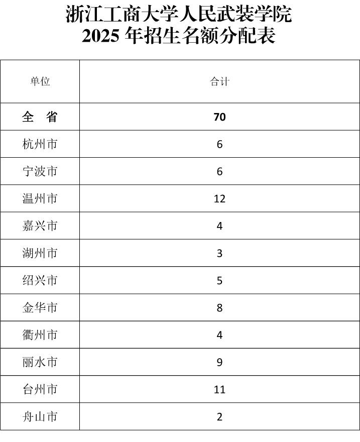 2025年浙江工商大学人民武装学院在浙江招生行政管理专业学生70人。