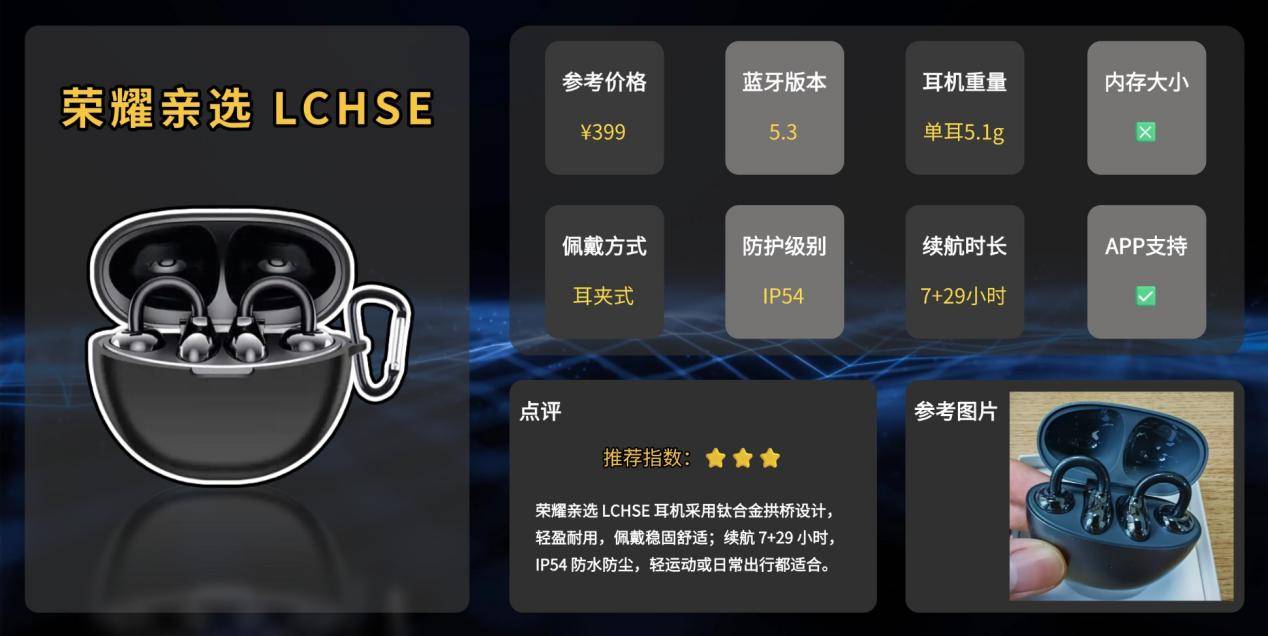 荣耀亲选在开放式耳机中主打性价比与年轻审美,整体技术偏实用路线;LCHSE属于品牌中轻量佩戴、日常运动定位的款式。