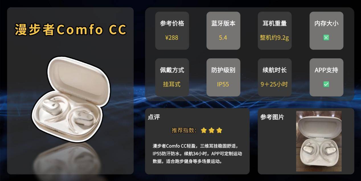 漫步者在耳机市场以高性价比和舒适佩戴体验见长,技术研发在运动耳机防护、降噪和智能功能方面有积累。Comfo CC在漫步者产品线中属于专业运动真无线耳机,主打舒适佩戴、智能降噪和运动数据记录。
