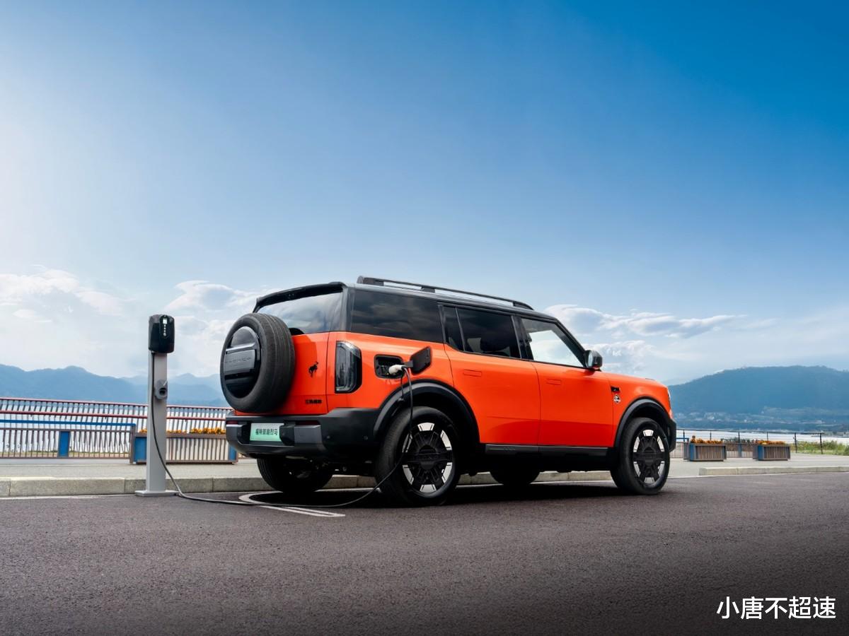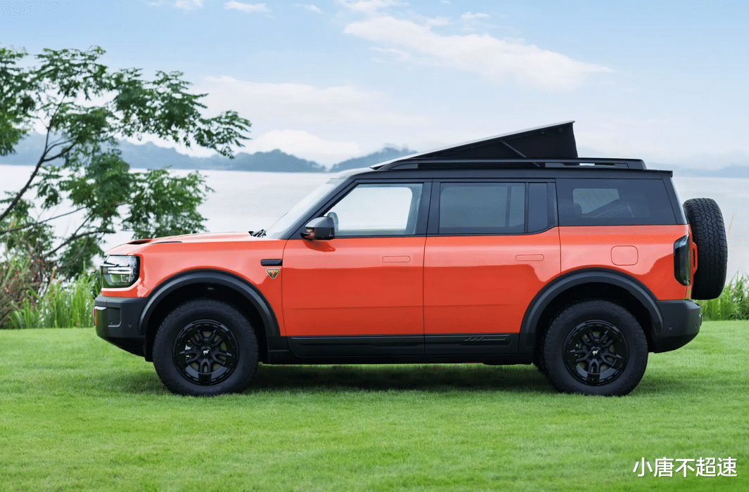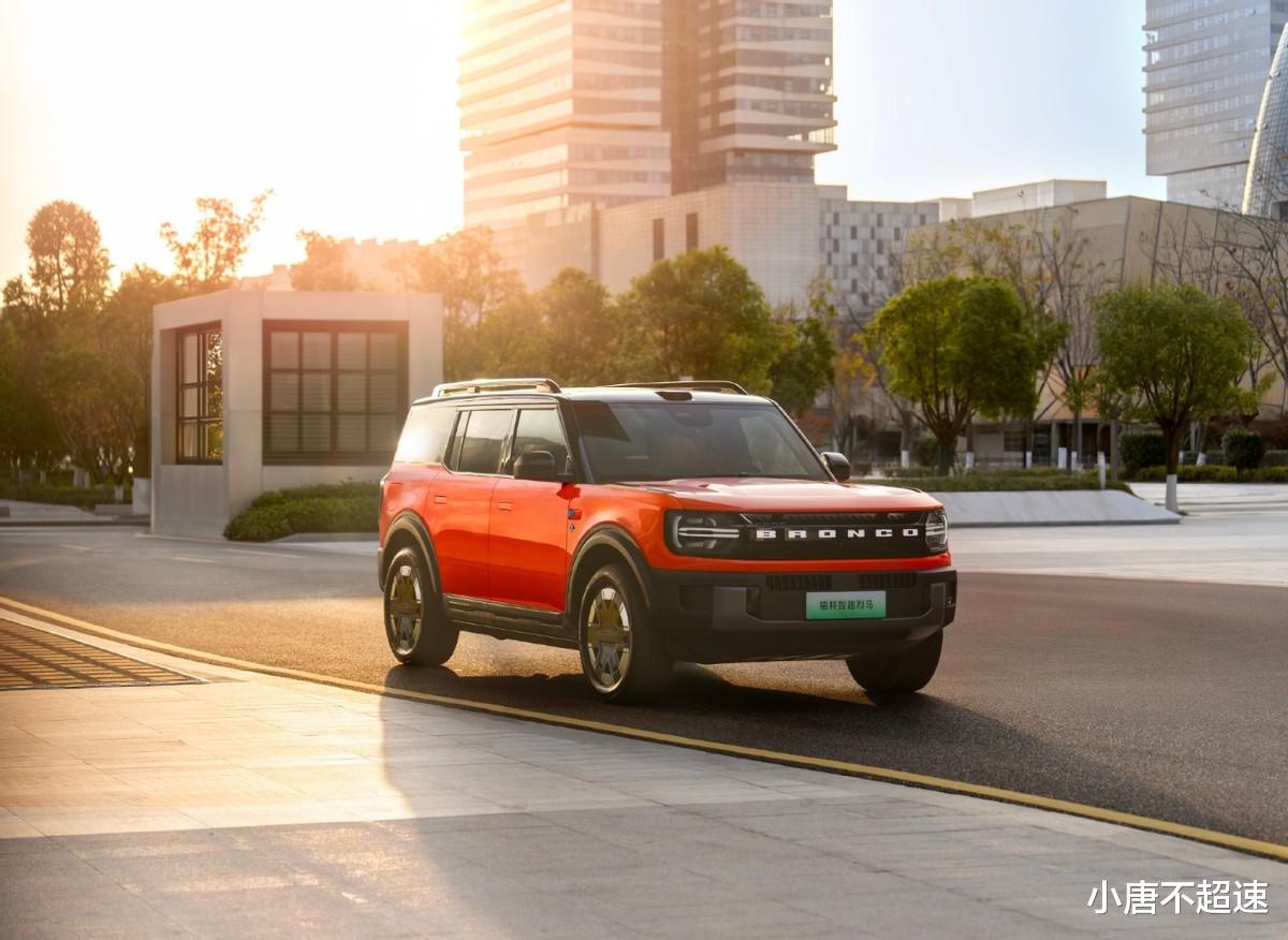 从外观来看,福特智趣烈马延续了烈马系列标志性的方盒子造型,车头配备可点亮的“BRONCO”标识,车尾采用竖向尾灯和侧开式尾门,并保留了外挂备胎。侧面采用隐藏式门把手与黑色轮眉,其车身长宽高约为5025/1960/1825毫米,轴距达到2950毫米,定位为中大型SUV。