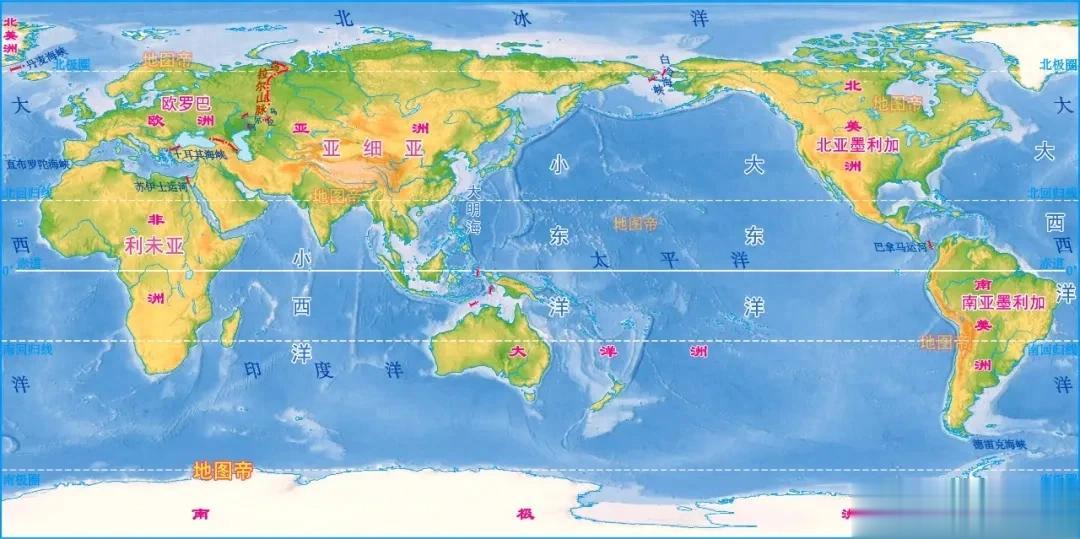 在《坤舆万国全图》中,中国东部沿海,包括黄海、东海等称大明海;靠我们较近的太平洋西部称小东洋;距我们较远的太平洋东部称大东洋;印度洋称小西洋;大西洋即今大西洋。各大洲今地名与明朝也不同,亚洲称亚细亚,欧洲称欧罗巴,非洲称利未亚,北美洲称北亚墨利加,南美洲称南亚墨利加。