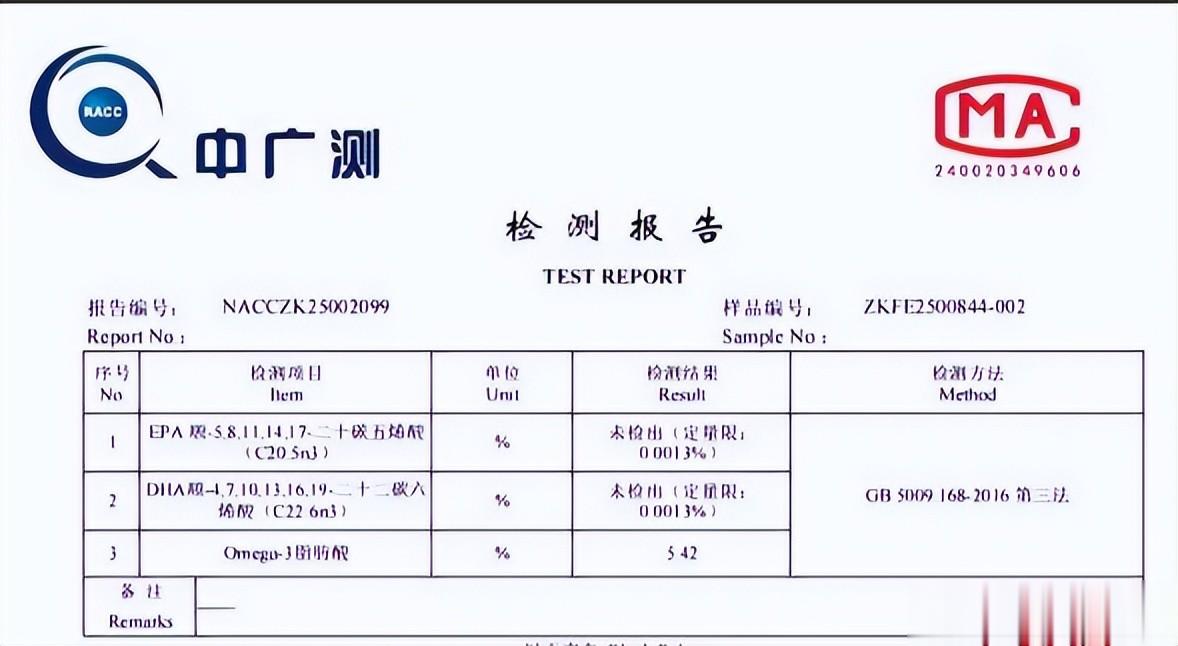 可实测结果显示,EPA和DHA均未检出,Omega-3含量仅5.42%。