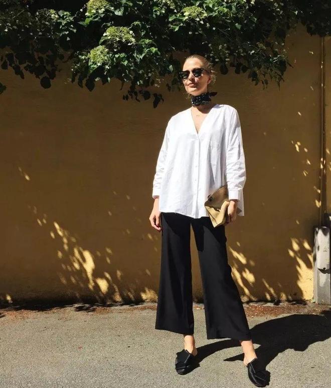 白衬衫和阔腿裤都是衣柜的基本款。如果你早上起来不知道上班穿什么,那就选择白衬衫搭一条阔腿裤,舒适又大方,准没错~