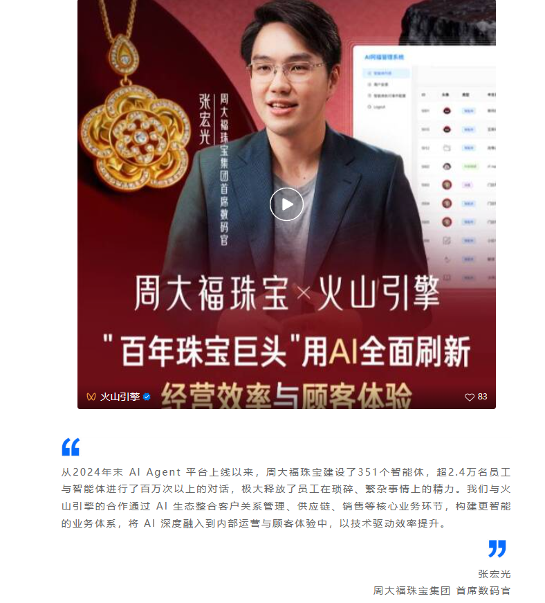 12月25日消息,火山引擎今日在公众号发文称,周大福珠宝通过与字节火山引擎合作构建了统一的“AI Agent平台”,并打造“AI阿福智能体家族”。目前超过350个智能体已经开始辅助市场、财务、人力资源等业务线员工进行工作。