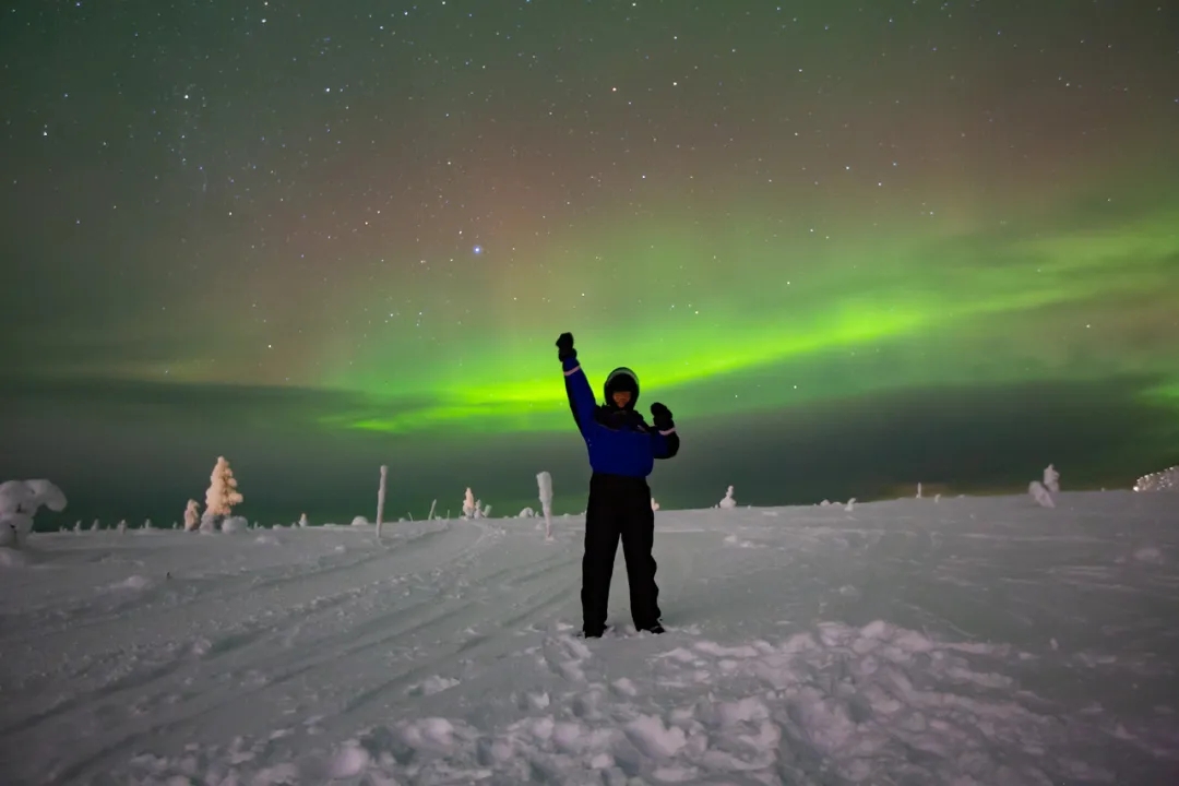 夜晚的极地雪鞋徒步(自费)是与自然对话的绝佳方式。跟随向导深入国家森林公园,穿上雪鞋在厚厚的积雪上行走,脚步声被雪地吸收,四周只剩下绝对的寂静。在向导指定的观测点静静等待,当极光在天际绽放时,绿色的光带随风舞动,与脚下的白雪相映成趣,这一刻,仿佛整个世界都属于自己。