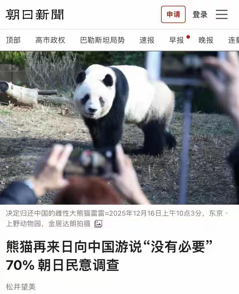 然而这份跨越半世纪的温情,终究难抵现实的外交寒流。12月23日《朝日新闻》的民调结果耐人寻味:面对"是否应游说中国续租熊猫"的提问,70%的日本受访者选择"没必要",仅有26%表示支持。