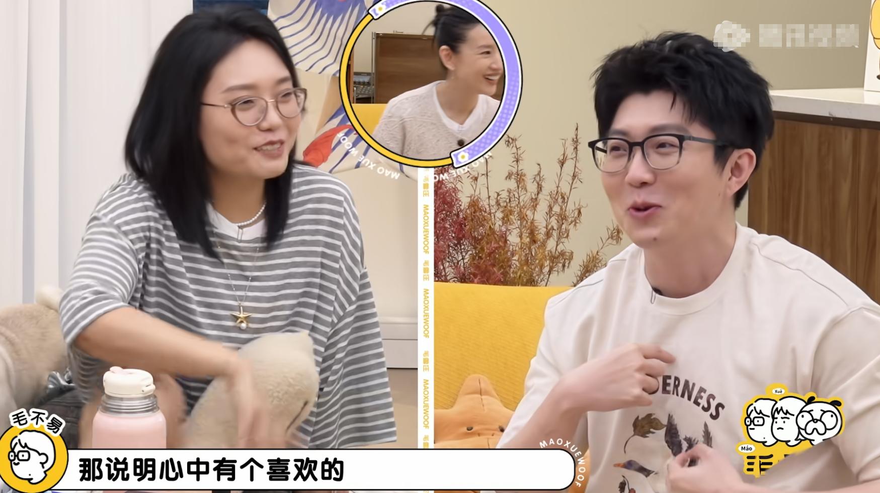 听到这句话,李雪琴和毛不易相视一笑,作为“过来人”,毛不易“翻译”:“说明他心里已经有一个喜欢的人了!”