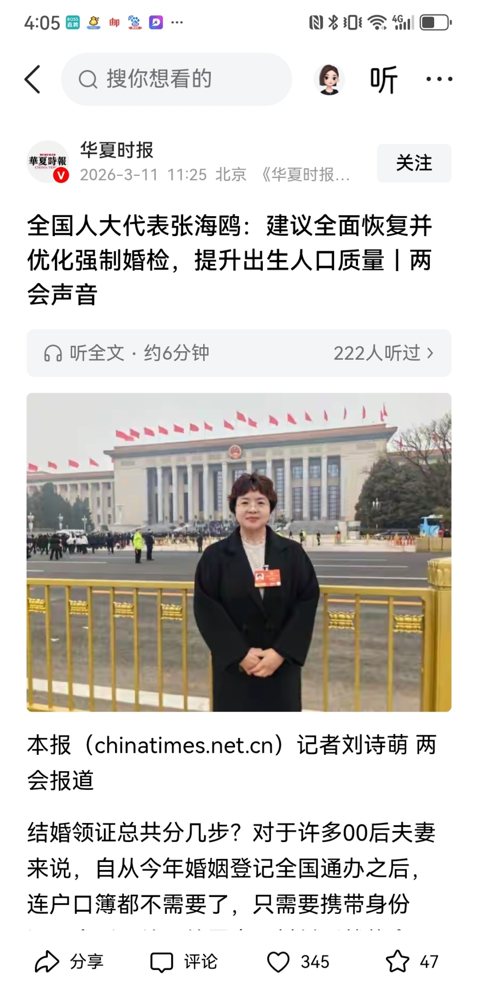 无疑代表建议全面恢复并优化强制婚检,极具现实必要性与紧迫性。希望有关部门尽快把该建议列上议事日程,将重大遗传病、艾滋病、梅毒等纳入必查,明确重大疾病信息须如实告知配偶,用制度守住知情权与健康权,让婚姻不再是“健康盲盒”。