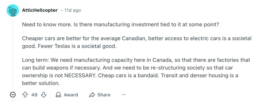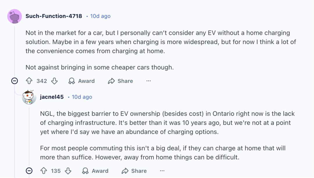 加拿大消费者希望拥有更多电动汽车选择。Abacus Data去年为Clean Energy Canada进行的民调显示,53%加拿大人支持降低关税以提升可负担性,29%甚至支持完全取消关税。正如一名网友所概括的那样:“我认为大多数人并不关心公司是谁的,他们只是想要电动汽车”。