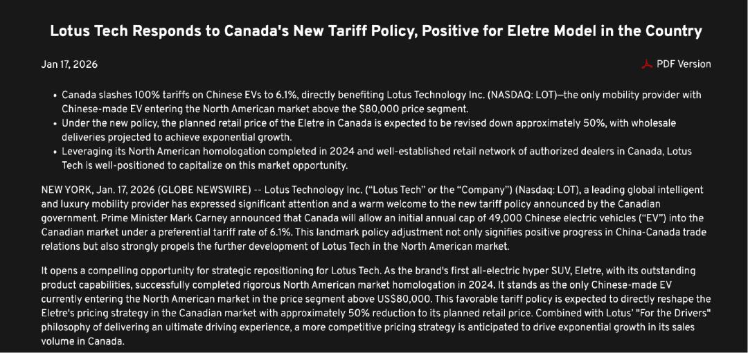 吉利旗下的豪华品牌路特斯显然也很有自信。路特斯在官网刊登了声明文章,表示作为路特斯首款纯电动超级SUV,Eletre凭借其卓越的产品性能,已于2024年成功通过北美市场严格的认证,是目前唯一一款进入北美市场、售价超过8万美元的中国制造电动汽车。新关税政策预计将使其计划零售价降低约50%,“有望推动Eletre在加拿大的销量实现指数级增长”。