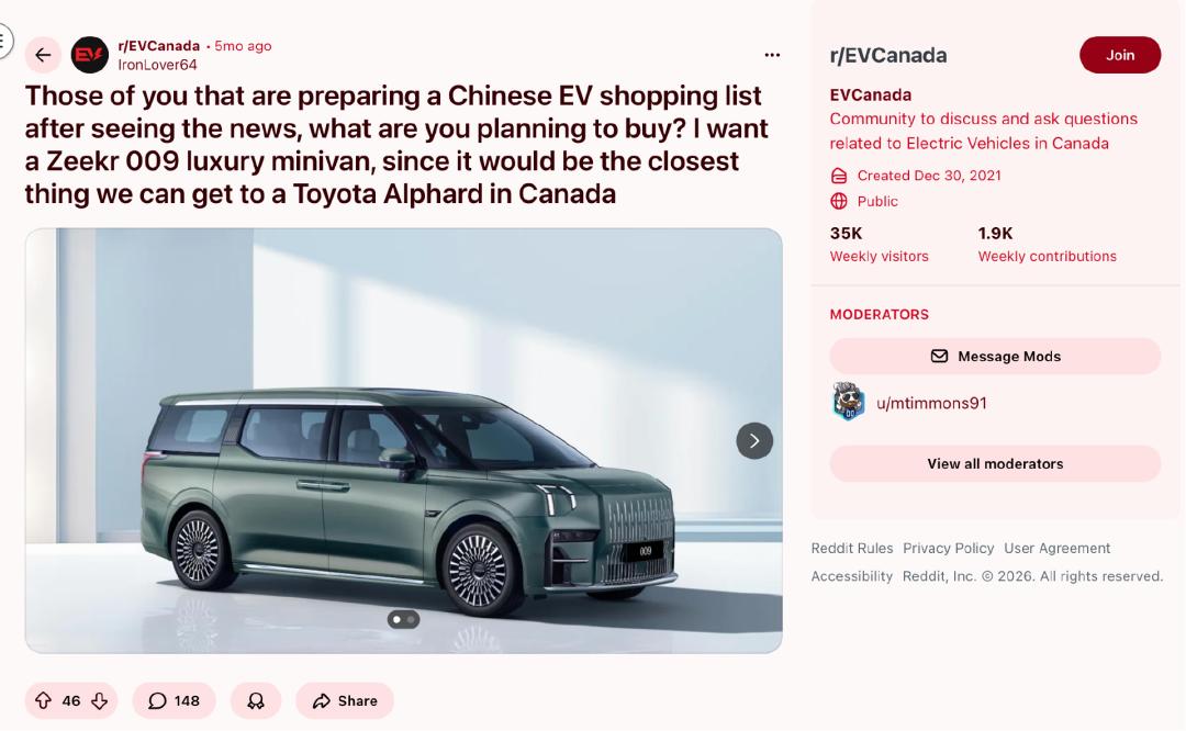 极氪同样频繁被点名。007、009 以及 7X 被认为是“目前北美市场缺失的一种产品形态”,价格明显低于传统豪华品牌,但配置和用料并不廉价。网友“lronLover64”发帖称:“我想要一辆极氪009豪华MPV,因为它是我们在加拿大能买到的最接近丰田埃尔法的车型了。”