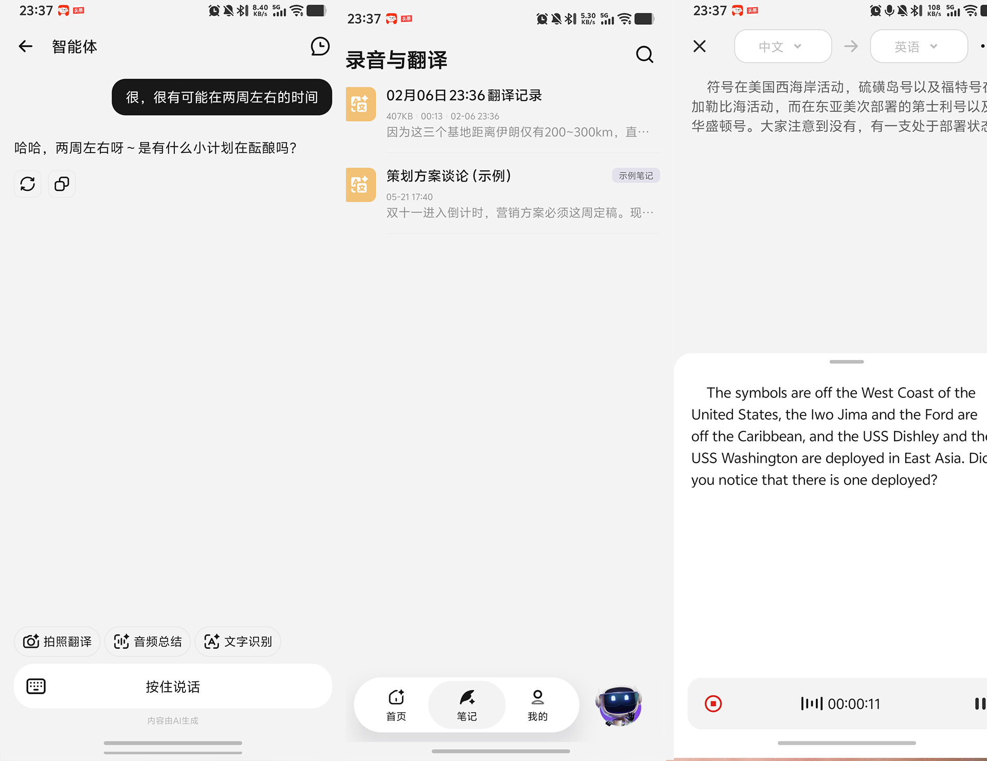 AI 功能是我最爱的点,简直是办公党福音。录音转写功能太实用了,开会、访谈时一键启动,能自动把语音转成文字,准确率超高,再也不用手忙脚乱记笔记,转写后的内容还能自动提炼重点、梳理逻辑,快速生成精简笔记,大大提升办公效率。还有多场景翻译功能,同声传译、面对面翻译、拍照翻译全都有,跨国会议时,耳边秒出译文,和外国客户沟通零障碍;一人一耳分戴耳机,还能实现面对面实时互译,出国旅游、涉外交流超方便。