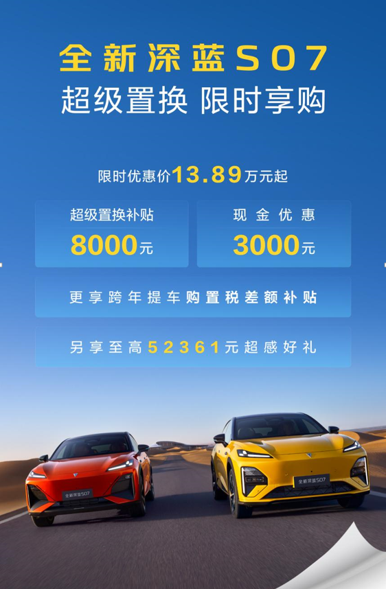 作为新能源汽车市场的全球大单品,全新深蓝S07上市后订单持续火爆。在国家新能源汽车购置补贴政策收官之际(截止2025年12月31日),深蓝汽车彰显“新央企”责任担当,正式升级全新深蓝S07购车权益:凡在2025年11月24日至11月30日24点下订,并于2026年1月31日24点前提车(以客户收车时间为准),即可在享受3000元现金礼金的基础上,置换补贴从5000元升至8000元,配合“购置税兜底”政策,以实打实的福利,展现深蓝汽车作为“新央企”的诚意与行动力。相关购车权益的具体细则,可联系当地深蓝汽车门店获取详细指引。