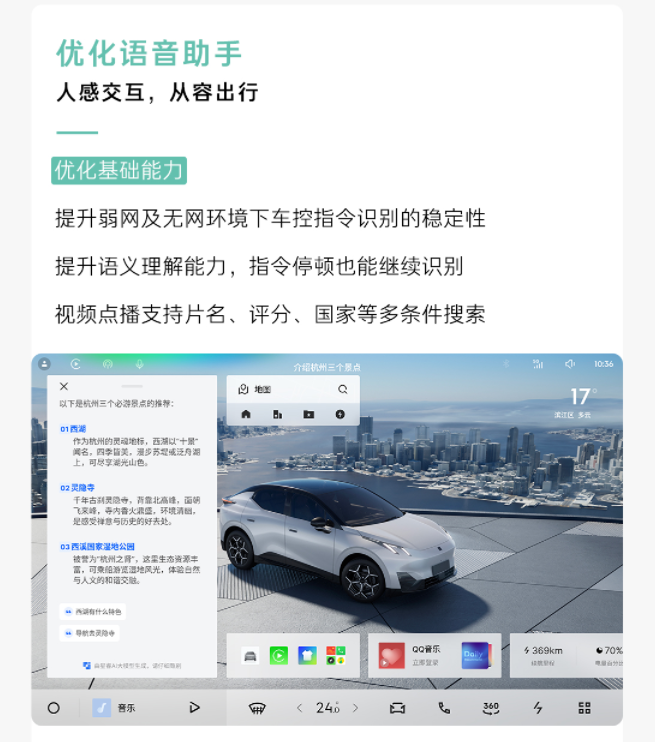 智能交互体系的全面升级,让座舱更具“懂人心”的能力。新增的动态壁纸功能,打破了传统座舱视觉的沉闷感,可根据不同出行场景切换专属视觉效果,为座舱注入个性化活力。语音助手则借助星睿AI大模型与DeepSeek大模型的双重加持,实现了交互能力的跨越式提升,不仅能完成情感对话、百科问答、新闻互动、视听空间切换、行程规划及用车答疑等多元任务,更在响应速度与识别准确率上大幅优化,支持多轮连贯对话与复杂指令拆解,让驾驶员无需手动操作,仅凭语音即可轻松掌控座舱功能,筑牢行车安全防线。
