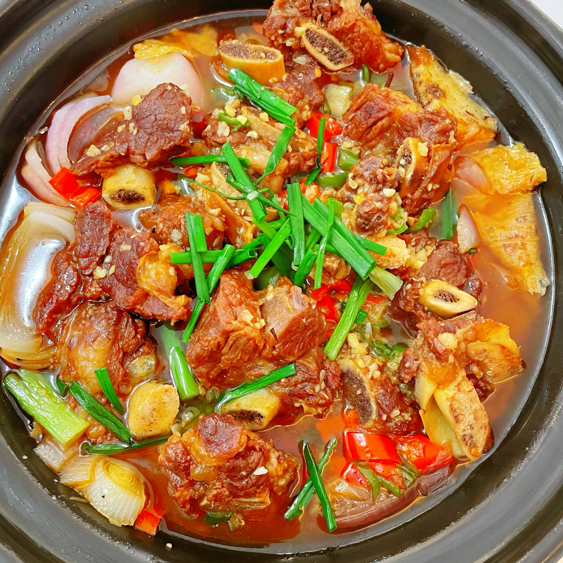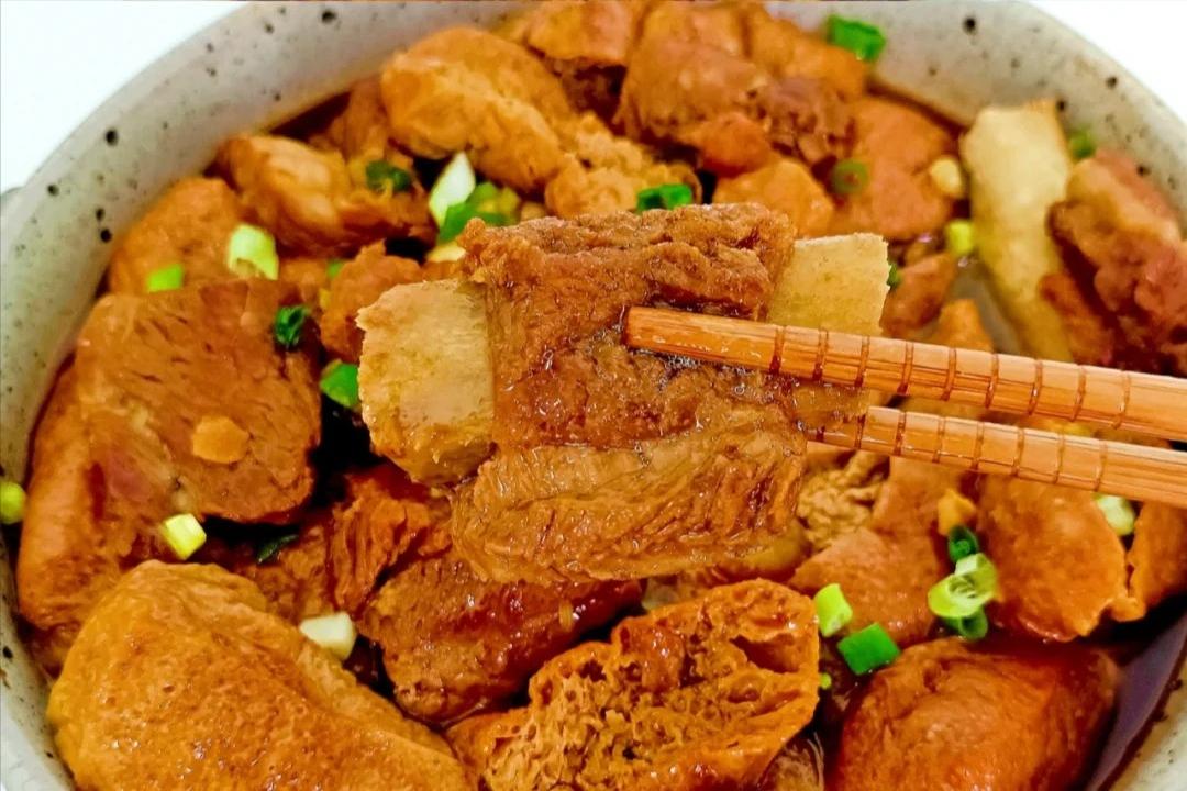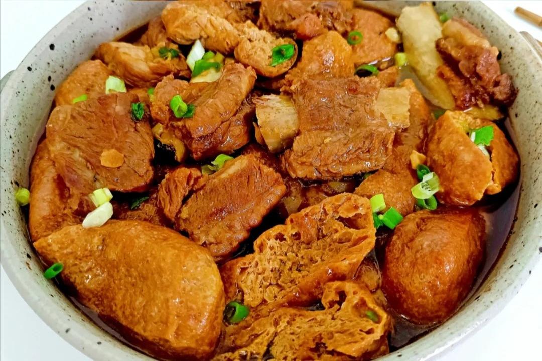 最后,撒上一把葱花,这道菜就大功告成啦!你看那油豆腐,一个个吸满了浓郁的汤汁,颜色红亮红亮的,看着就特别有食欲。咬一口油豆腐,那汤汁在嘴里爆开,咸香可口,太满足了!排骨也是鲜嫩多汁,轻轻一咬,肉就从骨头上脱下来了。再配上一碗热腾腾的米饭,把汤汁浇在米饭上,那简直是人间美味啊!