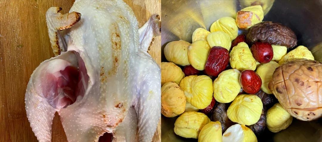 食材:一只鸡、适量板栗、香菇、姜片