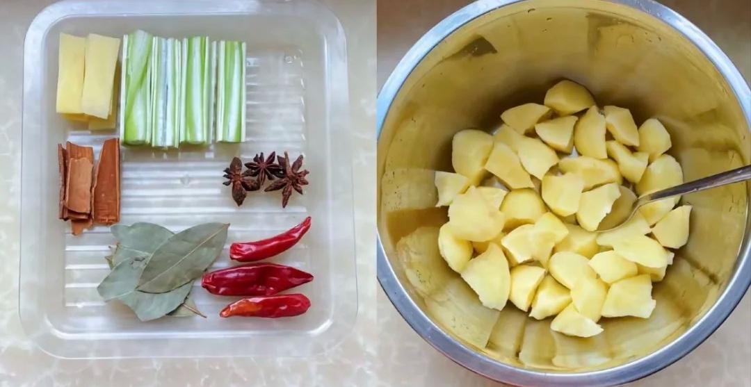 调料:葱段、姜片、八角、香叶、桂皮、几个干辣椒