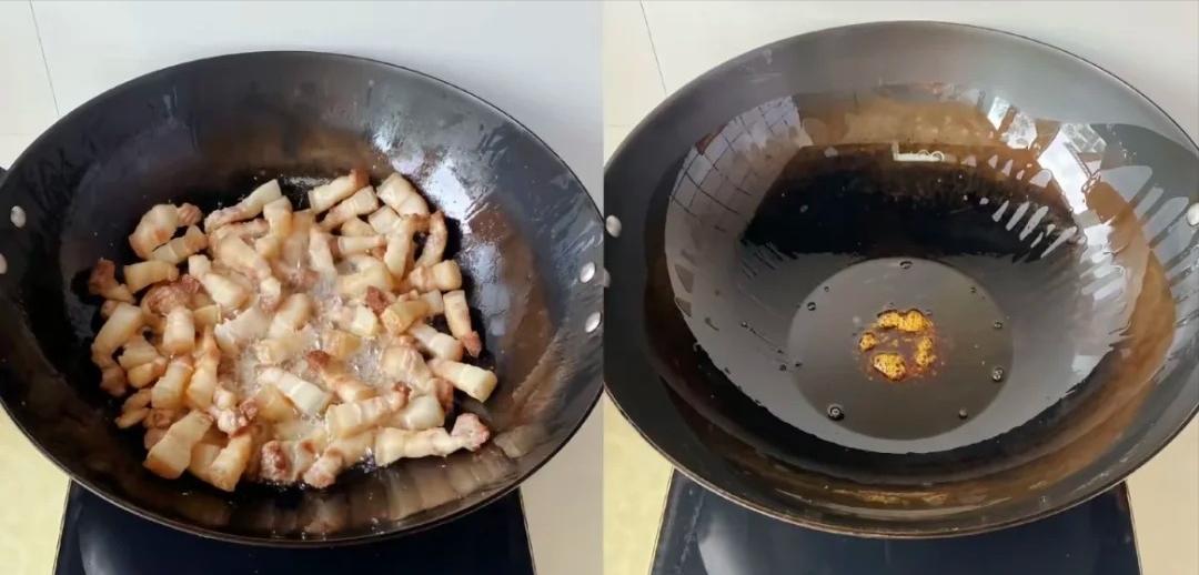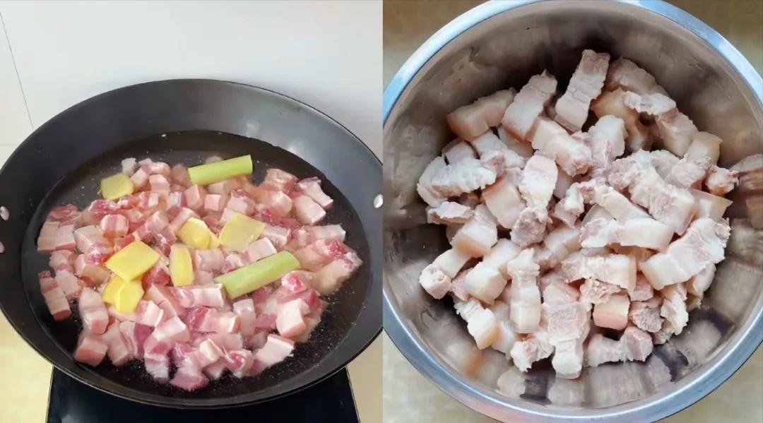 2、等水开了,把五花肉捞出来,用温水再洗一洗,然后用厨房纸把表面的水分擦干,放一边备用。接下来,咱开中火,锅里先别放油,直接把五花肉放进去翻炒。就这么炒啊炒,炒到五花肉表面有点微微焦了,就可以盛出来啦。