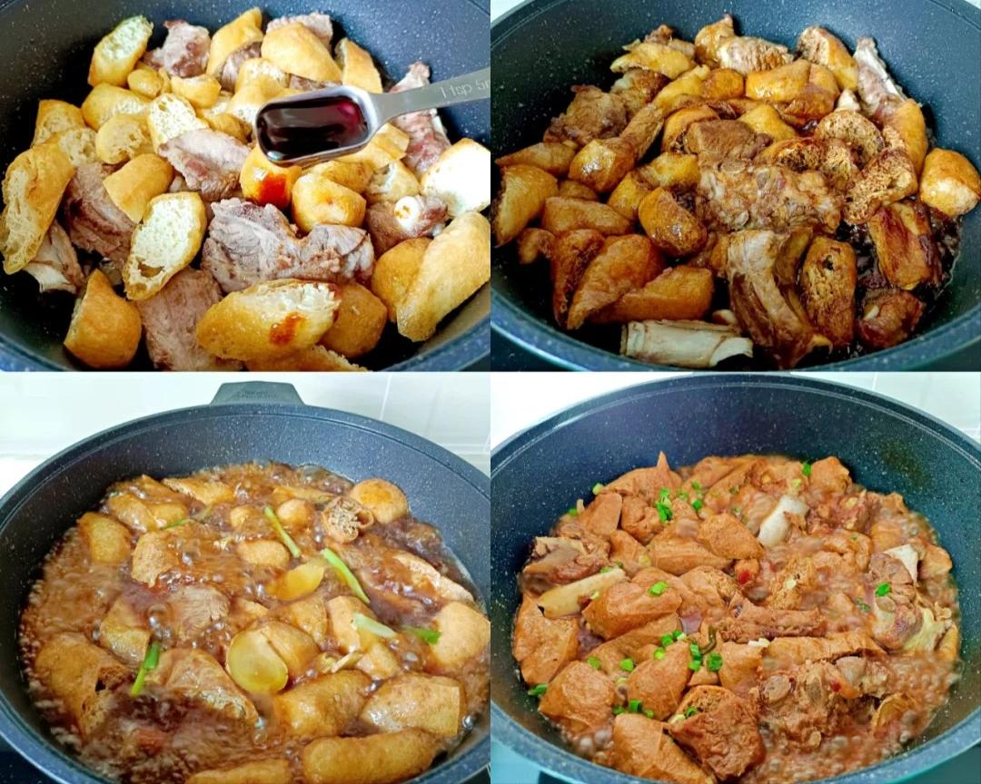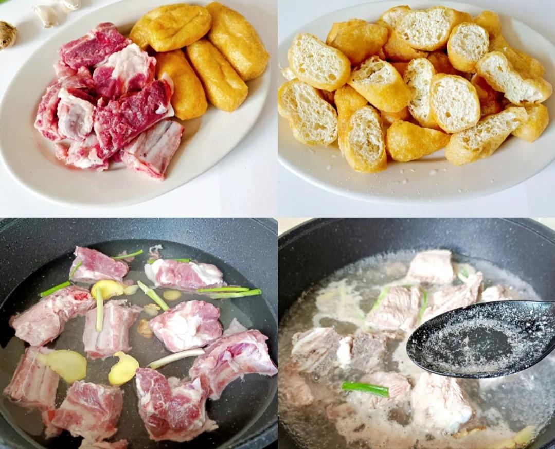 食材:一根排骨、10 个油豆腐、生抽和蚝油都来两勺、葱姜蒜、半勺盐