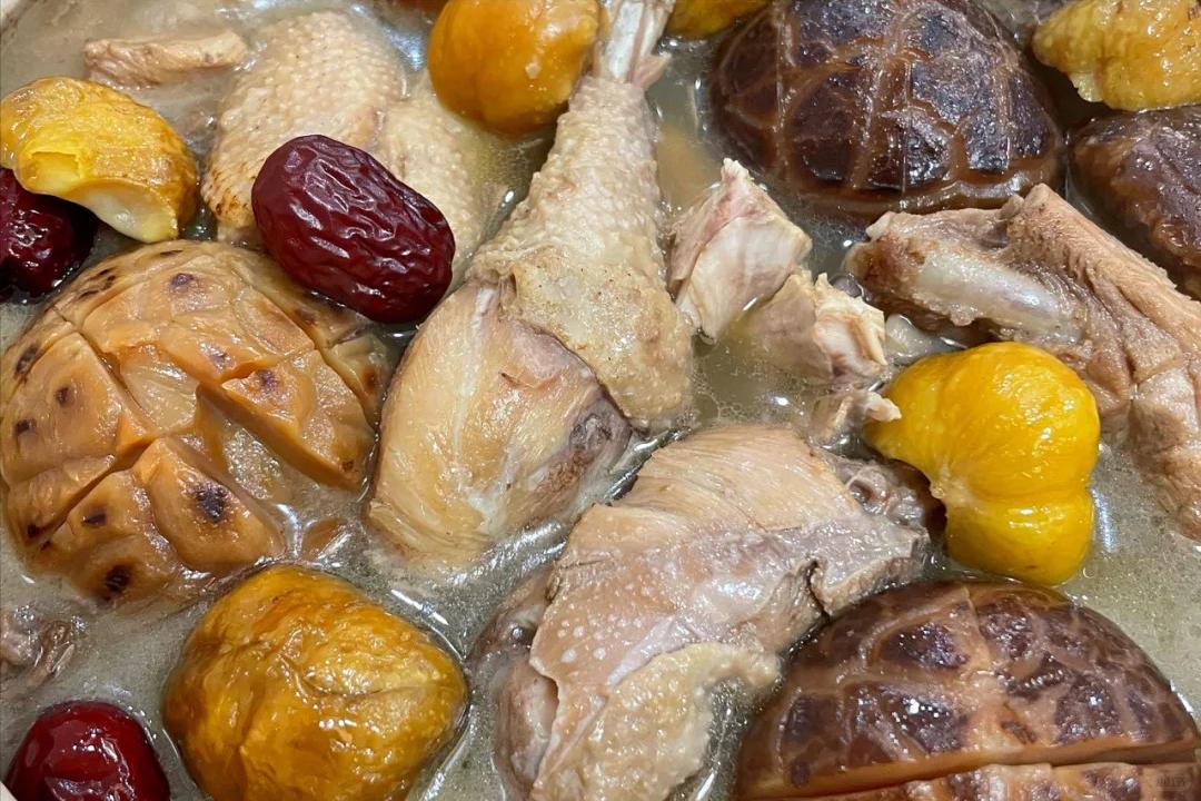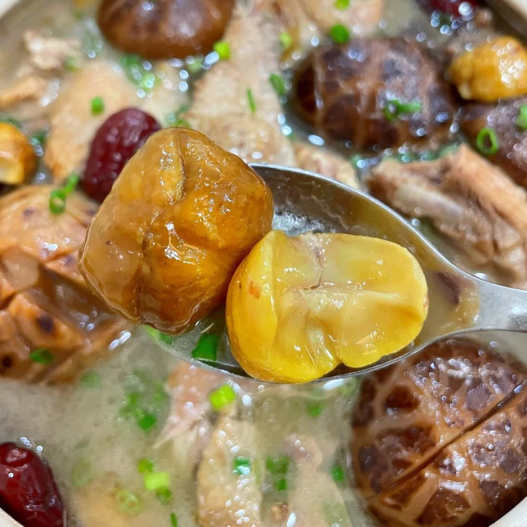 3、等板栗下锅炖了一会儿之后,就把泡发好的香菇也放进去。这香菇可是提鲜的关键,有了它,这汤的味道立马就不一样了。盖上锅盖,小火慢慢炖上 30 分钟。