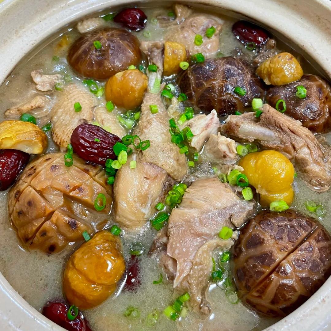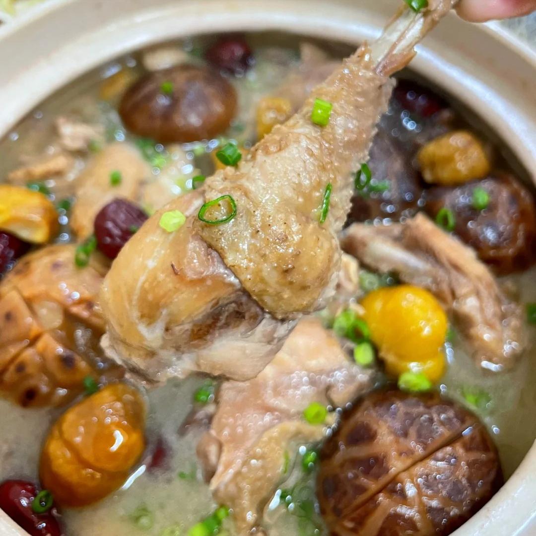 5、等 20 分钟过去,这香菇板栗炖鸡就大功告成啦!夹一块鸡肉,咬一口,嫩滑多汁,一点都不柴。板栗也炖得粉粉糯糯的,香菇更是吸满了汤汁的味道,好吃得停不下来。最后,撒上一把葱花,这颜值一下子就上去了,色香味俱全。
