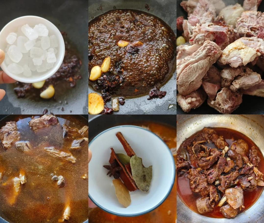 3、然后把洗好的排骨和大鹅放进锅里,用铲子不停地翻炒,让每一块肉都裹上料汁,变成漂亮的红棕色。等肉都上色了,就往锅里加清水,水要多加点,得没过这些肉才行。接着把八角、桂皮、香叶也放进去,这些香料就像魔法一样,能让这道菜变得更加美味。