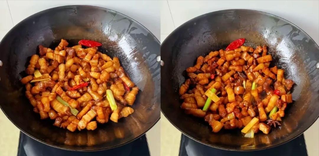 3、接着咱把火调成小火,往锅里倒点油,等油热了,就把冰糖放进去。这时候啊,你得不停地用铲子搅动,看着那冰糖慢慢融化,泡泡变成深咖啡色的时候,就赶紧把五花肉倒进去。这一步可关键了,能让五花肉裹上好看的糖色,味道也会更香甜。