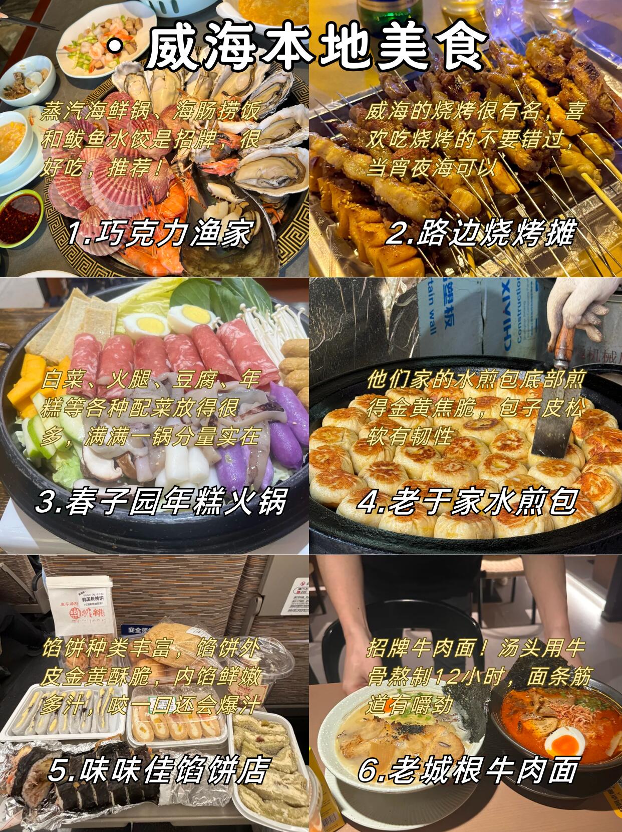 🔥打算下次还要来,因为不仅风景好,而且东西也好吃,✨巧克力渔家的蒸汽海鲜锅和海肠捞饭很好吃,还有✨老于家的水煎包好吃,底部脆脆的好吃,下次我还要去威海玩!